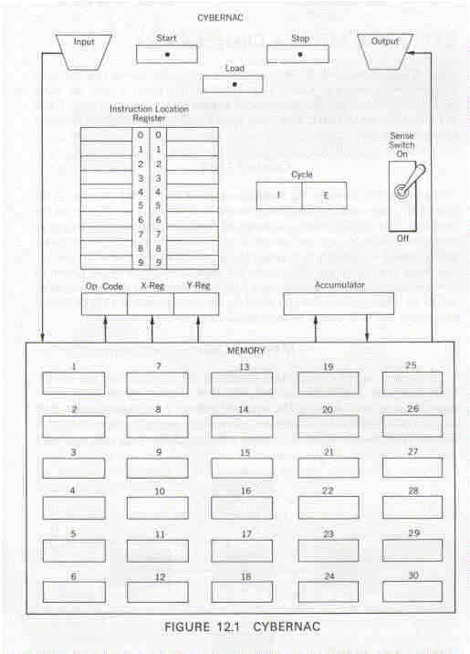 COMMAND OP-CODE X-ADR Y-ADR ACTION BRANCH 49 XX BRANCH TO MEMORY LOCATION XX B RANCH NEG 43 XX BRANCH TO XX IF ACCUMULATOR NEGATIVE BRANCH ZERO 44 XX BRANCH TO XX IF ACCUMULATOR ZERO NO-OP 41 DO NOTHING BRANCH BACK 42 LOCATION REG <- BRANCH BACK REG HALT 48 STOP CYBERNAC received nation wide publicity in the book "Data Processing for Decision - Making" by Brightman, Luskin, and Tilton, Macmillan 1968 & 1971. Below is the general diagram pertaining to the simulator.