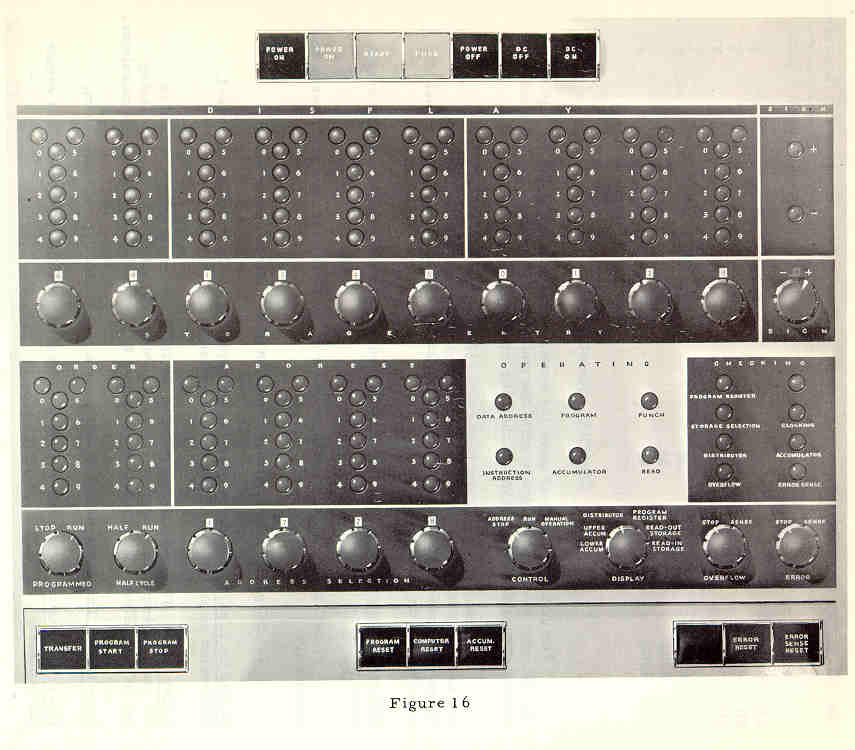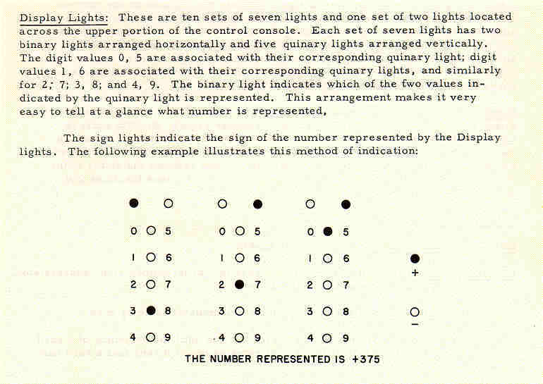 It used an interesting system of bi-quinary lights to represent values. With a little training anyone could learn how to read the values. This system was definitely superior to the binary CRT display of the Royal McBee LGP-30.