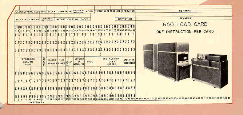 NOTE: This card for the IBM 650 was designed for only one machine language instruction, and you place a hand written instruction on the right to indicate what you were trying to do.