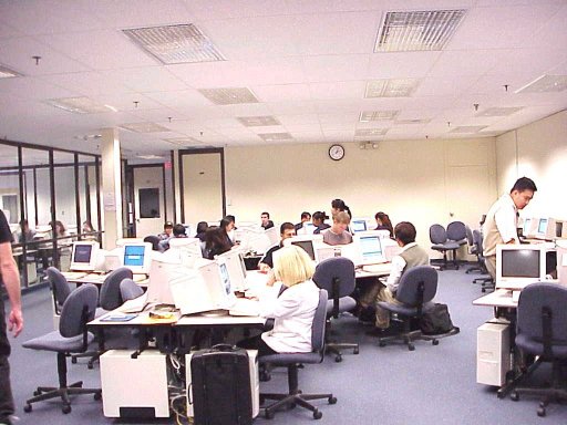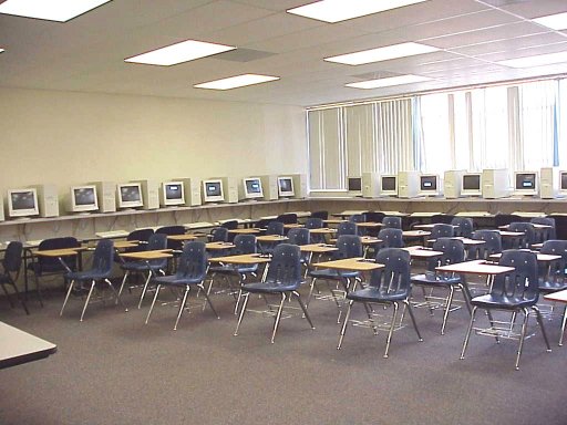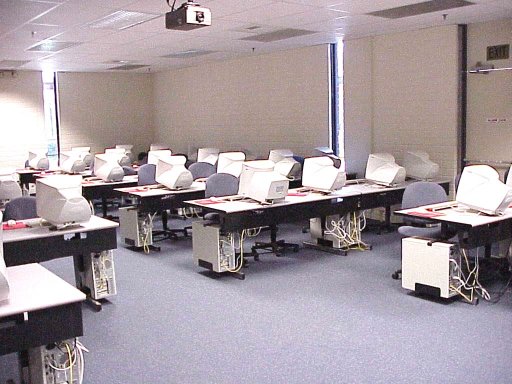 The college has some 2200+ computers located in faculty offices and other labs around the campus. Here is one set up for Journalism classes. Computers around all 4 walls. {note the lights are a bit different than in the computer center}.
