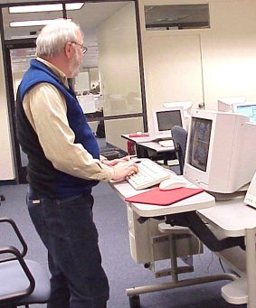 The most impressive part of the facility is an 85 seat open lab open designed in such a fashion that it can not be turned into a classroom. Workstations are arranged 4 to a table and the tables layed out at 120 degree angles forming a molecular structure. The work tables are arranged around triangular stands. This arrangement guarentees this lab will always be open to all the students. Following a tradition started in 1960's the lab is open like the library, but when push comes to shove students have priority.