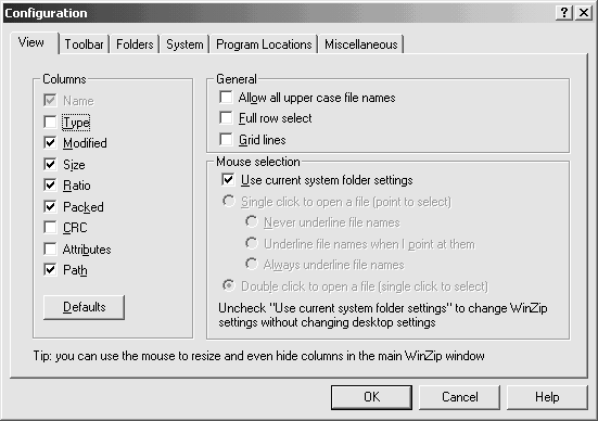 The View property sheet is divided into three sections, as shown in Figure 6-1. The Columns section allows you to specify the columns of information that are displayed in the WinZip Classic main display area, including Type, Modified, Size, and so on. As Figure 6-1 shows, not every column is displayed by default (Type, CRC, and Attributes are unchecked) because WinZip displays only those columns that are likely most important for you to see. Check or uncheck any column to add or clear its selection, or click the Defaults button to restore WinZip to its original column selections.The General section provides the following three options, which configure how data is displayed and selected in the main WinZip display area: