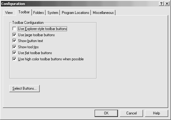The Toolbar property sheet's six configuration options control the appearance and behavior of the WinZip toolbar, as shown in Figure 6- 3.