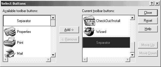 To add an icon to the toolbar, select it from the Available toolbar buttons list and click Add. To remove a toolbar icon, select it from the Current toolbar buttons list and click Remove. The list of icons on your toolbar will match the list in the Current toolbar buttons window.