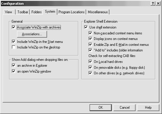 The System property sheet, displayed in Figure 6- 6, is divided into three sections: General, Show Add dialog when dropping files on, and Explorer Shell Extension. The General section allows you to control the types of archive files WinZip works with and where shortcuts to WinZip are placed.