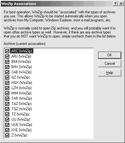 Configures Windows to use WinZip as the default application for working with archives. The Associations button opens the WinZip Associations screen, shown in Figure 6-7. By default all listed archive types are selected. Clearing an archive's selection removes WinZip as the registered Windows application associated with that archive file type, but unless you have a specific reason to do so, you should not remove any of these associations.