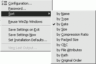 To configure the way that files are displayed in the main WinZip Classic display area, specify a sort order. To sort based on any column heading, select the Sort option on the Options menu and then select a column name, as shown in Figure 6-11.