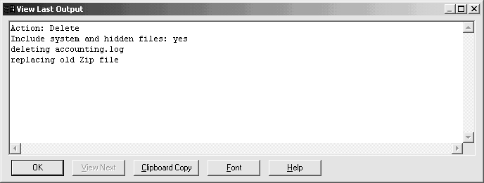 - View Last Output. Displays a log showing the results of the last WinZip operation. This option is available only when you have an open archive and have performed at least one operation on it such as adding a new file.